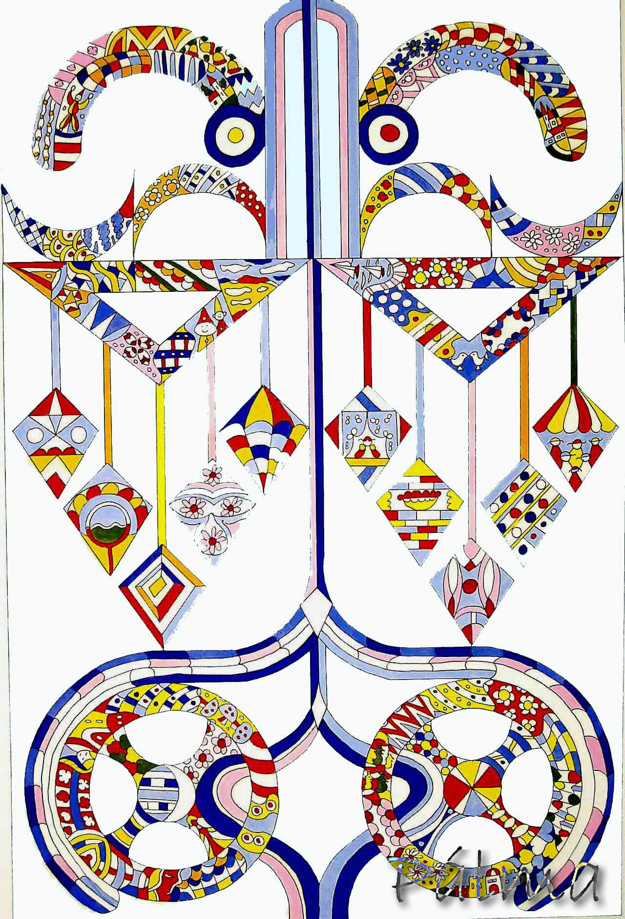 egy helyi mesevilág ábrázolása. Jelen van rajta a tragikus sorsú szerelmes pár és családjuk, a kolostor, és a kolostori kórus ahol a leány menedékre lelt.